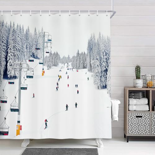NYMB Sport duschdraperi, vintersemester resor snö berg skidåkning kabel bil, polyestertyg snö baddraperi, jul badrum duschdraperi set med krokar, 152 x 178 cm