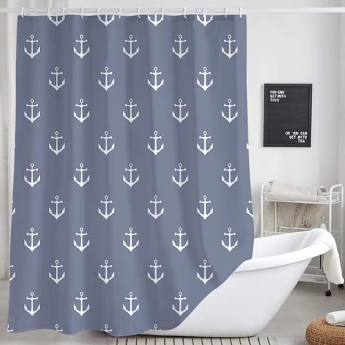 DYNH Badrumsduschdraperi, blått och vitt nautiskt mönster med ankare dekorativt tyg duschdraperi set hav män pojkar barn dekorativa tillbehör krokar ingår