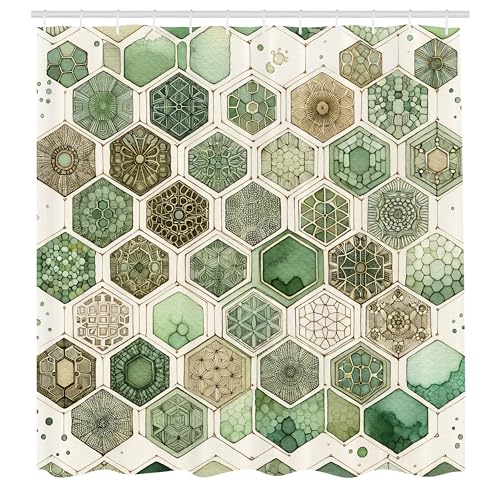 ABAKUHAUS Salvia-grönt duschdraperi, hexagon honungskaka mönster med abstrakta trippiga ornament i jadettoner, tygtyg med krok, 175 x 200 cm, äggskal karamell turkos