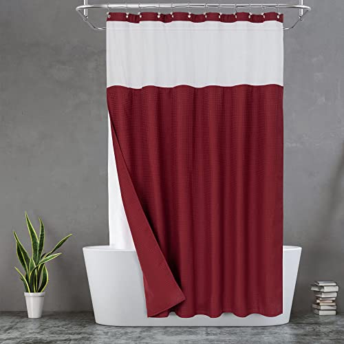 N&Y HOME Duschdraperi med våffelväv med knäpp-in-tygfoder och 12 metallkrokar set – hotellstil, vattentätt och tvättbart, tungviktstyg och nätfönster – 71 x 72, vinröd