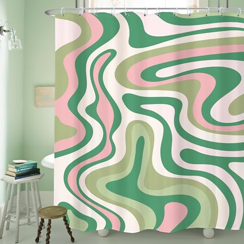 LIGHTINHOME - Abstrakt duschdraperi rosa och grön, 152 cm bred x 182 cm hög, bohemisk, spiral, modern, estetisk, 2000 och 70-talet, retro, vacker badrumsdekoration, polyester, vattentät
