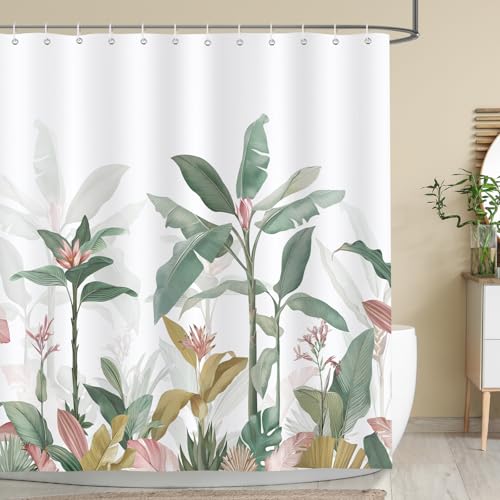 Bonhause Duschdraperi med tropiska blad, rosa grön bananblad badrumsdraperi 180 x 180 cm vattentätt mögel- och mögelbeständigt polyestertyg duschdraperi med 12 krokar