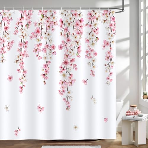 LIVILAN Körsbärsblomning badrumsgardin med krokar, rosa blommig duschdraperi tyg Sakura baddraperi, dekorativt blomma duschdraperi för badrum maskintvättbart, 183 cm B x 183 cm H