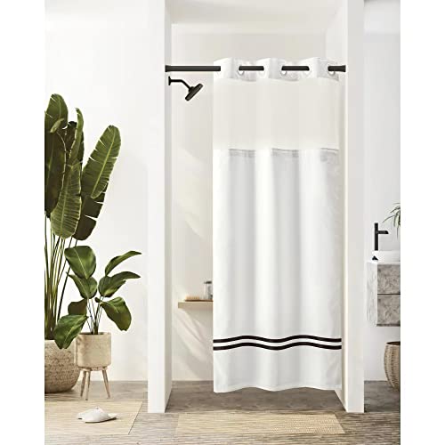 Duschdraperi med tryckknappsfoder, inga krokar behövs duschdraperi för badrum, hotellkvalitet, maskintvättbar, 91 cm B x 183 cm H, vit, med svart rand och magneter