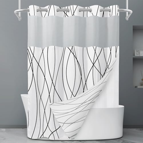 LXBNI Ingen krok svartvitt randigt duschdraperi med snäppa i tygfoderset – hotellduschdraperi och foder set med genomskinligt nätfönster i toppen, maskintvättbar, 180 x 180 cm