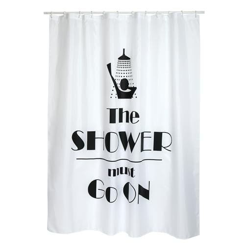 WENKO Duschdraperi Yak, hygienisk textilgardin, tvättbar, vattenavvisande och lättskött, med 12 ringar för fastsättning på duschstången, 180 x 200 cm, vit/svart