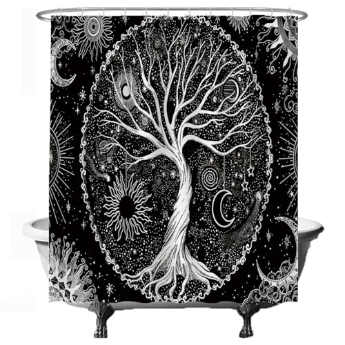 Ulticool duschdraperi – livets träd, svart, vitt – 180 x 200 cm – tvättbart – vattentätt – antimögel – med 12 ringar