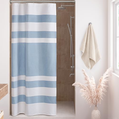 Madison Park duschdraperi våffelväv randig design tyg duschdraperi med 3 m Scotchgard fukthantering premium spa-kvalitet moderna duschdraperier för badrum höga 183 cm x 213 cm blå