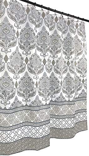 Grå brungrå vit kanvas tyg duschdraperi: blommig damast med geometrisk kantdesign