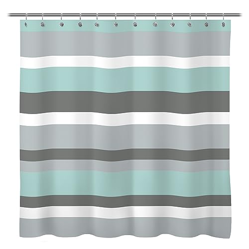 Solbelyst vattenblå grå horisontella ränder vattenavvisande tyg duschdraperi set med förstärkta metallöljetter och ringar uppfriskande randig design mögelbeständig polyester badrumsdekor