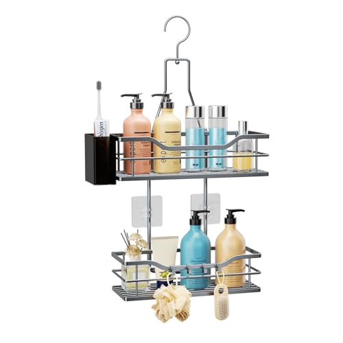 MOGFCT Badrum duschhylla över dörren hängande duschförvaring aluminium duschhylla rostsäker badrumshyllor korgställ med krok rostfri (silver)