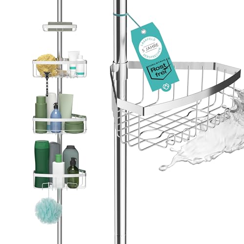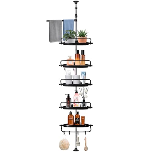 NEMMXUB Teleskopisk hörnduschhylla, borrfri, badrumshylla, duschhylla i rostfritt stål, justerbar höjd, med 5 hyllor, 1 handdukshållare och 4 krokar, 95–320 cm