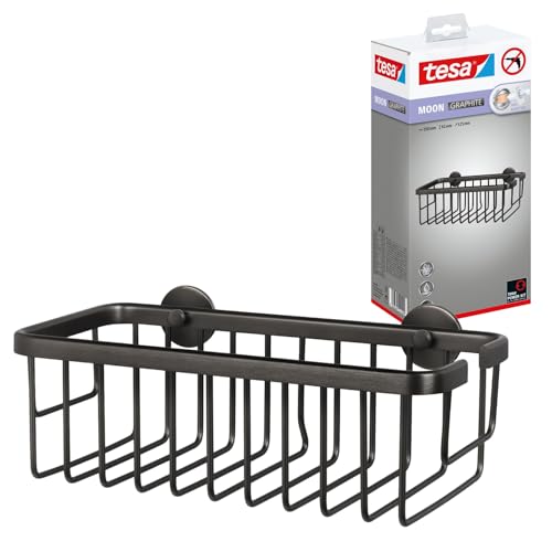 tesa MOON självhäftande duschhylla i borstad grafit – ett våningsplan och extra djup – duschhylla av PVD-belagd metall – ingen borrning, med självhäftande lösning – 92 mm x 250 mm x 125 mm