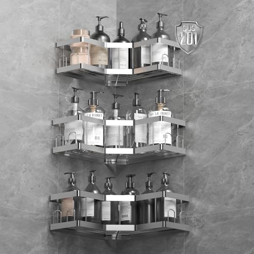 Dusch Caddy, 3 Pack Silver Badrumshyllor, 201 Rostfritt Stål Självhäftande duschhylla Ingen borrning, Svart duschförvaring, Duscharrangör, Rostbeständig duschcaddyhörna