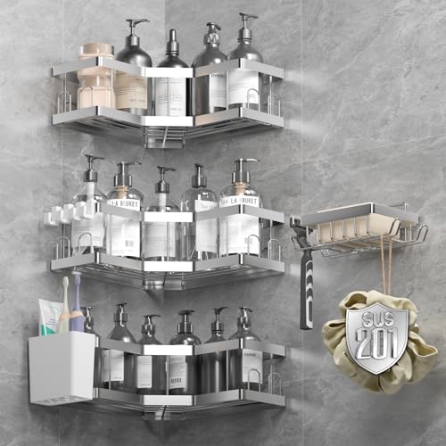 Dusch Caddy, 5 Pack Silver Badrumshyllor, 201 Rostfritt Stål Självhäftande duschhylla Ingen borrning, Svart duschförvaring, Duscharrangör, Rostbeständig duschcaddyhörna