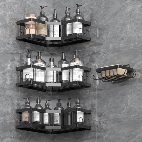 Dusch Caddy, 3 Pack Svart Badrumshyllor, Kolstål Självhäftande duschhylla Ingen borrning, Svart duschförvaring, Duscharrangör, Rostbeständig duschcaddyhörna