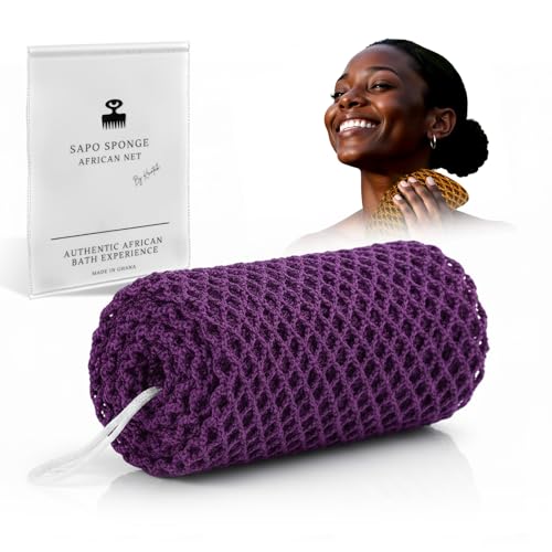 Äkta afrikansk nätsvamp från Ghana med upphängningssnöre Lång peelingvamp för kropp och rygg Duschsvamp Perfekt för daglig kroppsvård (Lila)