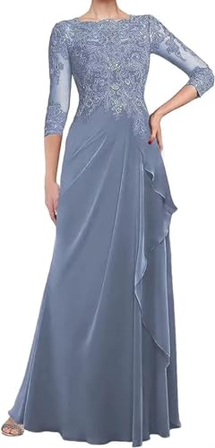 WSEYU Brudens mor klänningar för bröllop långa 3/4 ärmar spetsapplikationer veckade brudgummens mor klänningar rund hals, Blå (Dusty blå), 46 SE/Plus