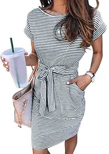 MEROKEETY Women's Summer Striped Short Sleeve T Shirt Dress Casual Tie Waist with Pockets Dusty Blue