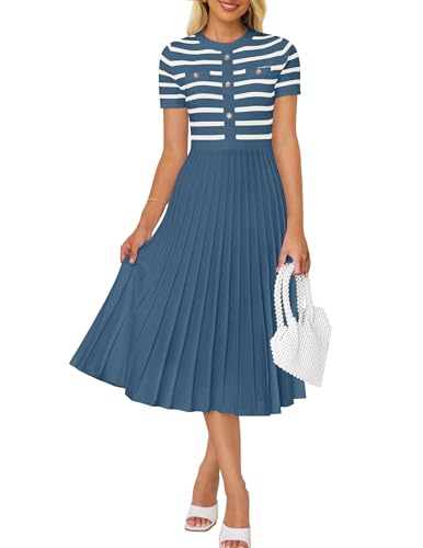 ZESICA Women's 2025 Casual Striped Midi Dress Crewneck Short Sleeve Button Ribbed Knit Swing Pleated A Line Dresses,Dusty Blue,Medium