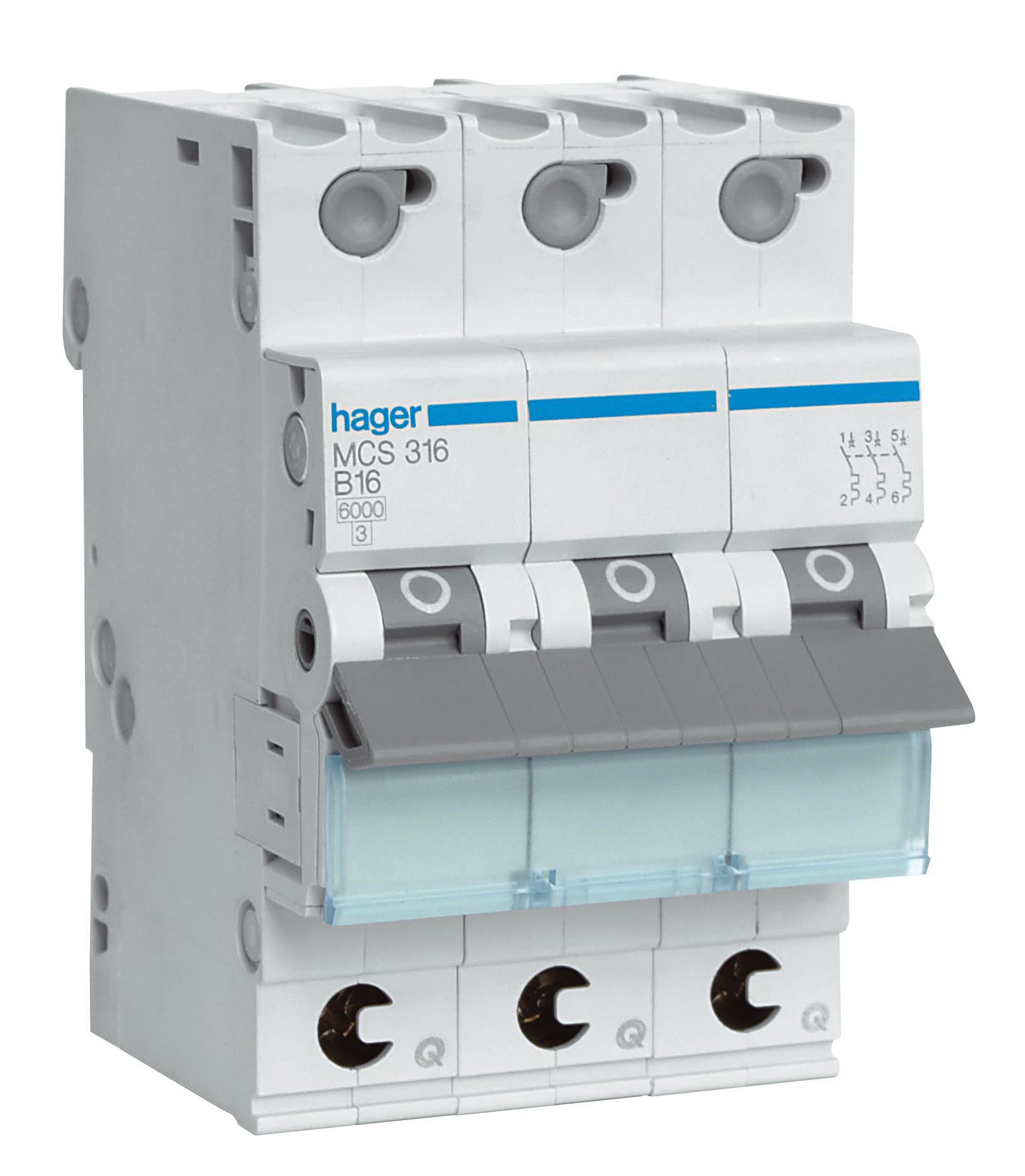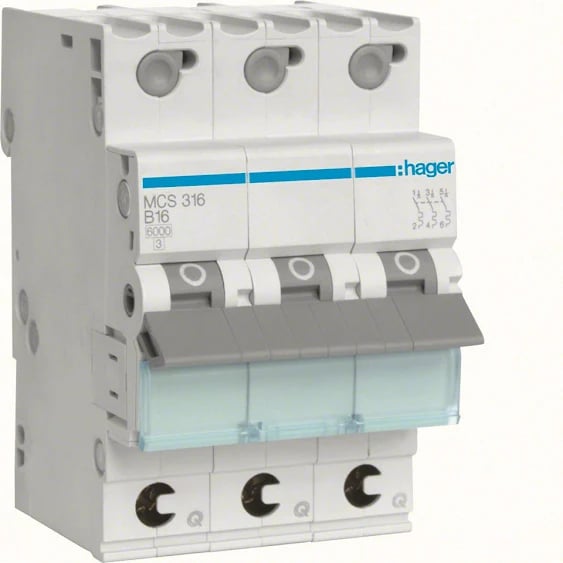 Hager MBS316 Dvärgbrytare 3-pol, 6kA, B-karakteristik 16A