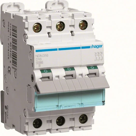 Hager NDN316 Dvärgbrytare 3-polig, 10kA, D-karakteristik 16A