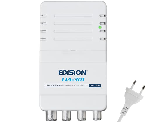 EDISION LIA-301 Förstärkare TNT TV-antenn UHF/VHF, justerbar 5-20 db, 98 dBmV, för digital marksänd DVB-T/T2, med 5G LTE-filter, 1 ingång, 3 utgångar, IEC-kontakter