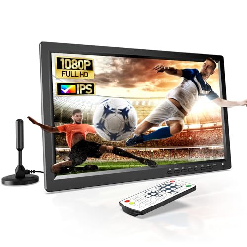 DESOBRY 15,6 tums bärbar TV med antenn, bärbar liten TV med DVB/T2-mottagare, uppladdningsbart batteri, mini-TV, LCD-skärm 1080P, integrerat TV-stativ, HDMI-ingång, USB