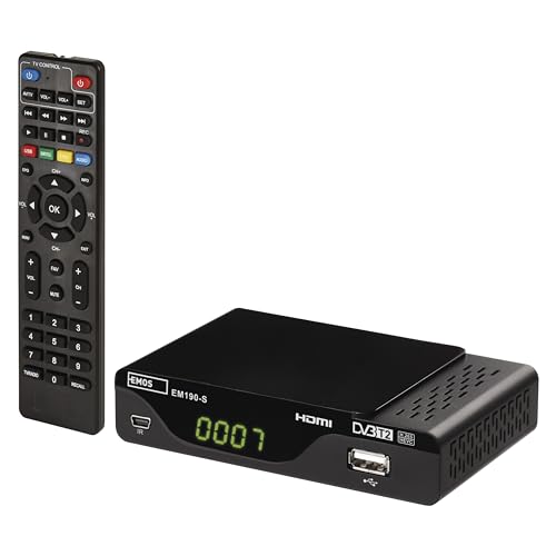 EMOS HD DVB-T2 H.265 HEVC-mottagare med USB, HDMI, scart och koaxialanslutning, fjärrkontroll och infraröd sensor, PVR, mediaspelare och EPG-funktion, 1080p