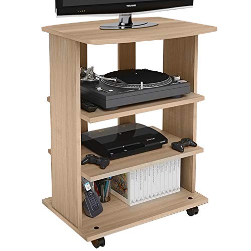 BAKAJI TV-bänk i MDF-trä med 3 hyllor för konsoler för videospel DVD och 4 hjul skåpvagn TV-hållare modern design storlek 60 x 45 x 80,5 cm (ek)