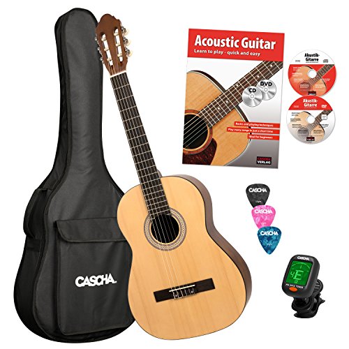 CASCHA HH 2043 EN konsertgitarr 4/4 paket, filtfilt, inklusive engelsk gitarrskola med CD + DVD, stämutrustning, vadderad väska med Notfack och ryggsäckgarnitur, 3 plektrum naturmatta