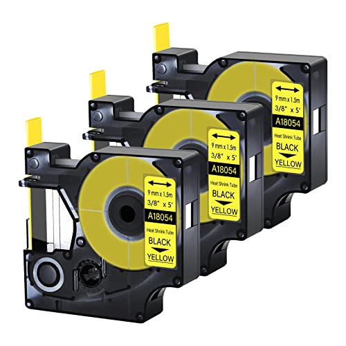 3-pack Cruxer ersättning för DYMO 18054 industriell värmekrympslang tejp 9 mm 1,5 m värmekrympslang etikett svart på gul kompatibel med DYMO Rhino 4200, 5200, 5000, 6000 etiketttillverkare
