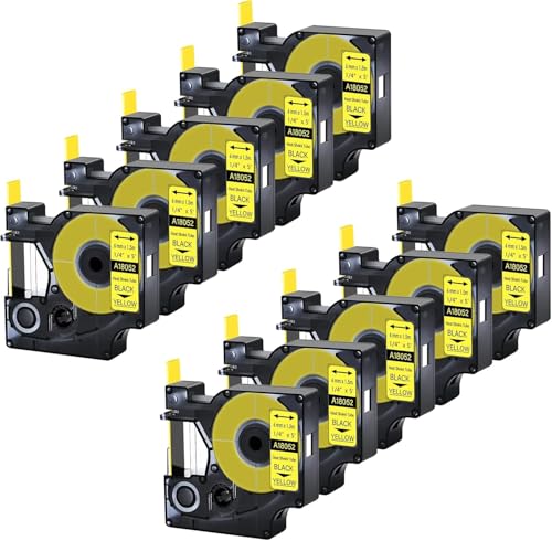 10-pack Cruxer ersättning för DYMO noshörning etikettband 18052 1/4 tum 6 mm 1,5 m värmekrympslang etikettband svart på gul noshörning etikettband 10851 kompatibel med DYMO Rhino 4200 5200 5000 6000 etiketttillverkare