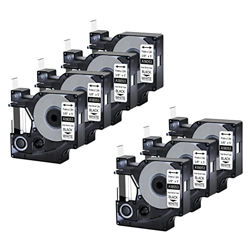7-pack Cruxer ersättning för DYMO 18053 industriell värmekrympslang tejp 9 mm 1,5 m värmekrympslang etikettband svart på vitt kompatibel med DYMO Rhino 4200, 5200, 5000, 6000 etiketttillverkare
