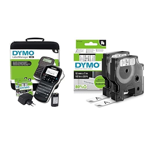 DYMO S0968990 Etikettskrivare, Svart & DYMO D1-originaletiketter | Svart utskrift på vitt | 12 mm × 7 m | Självhäftande etiketter för LabelManager-etikettskrivare | 2 st.