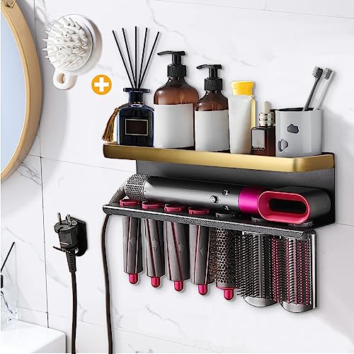 Moqing Väggfäste för Dyson Airwrap, metallhållare arrangör för plattjärn, plattborste, hårplattare, olika lockiga hårpinnar, tål höga temperaturer, aluminium (svart och guld)