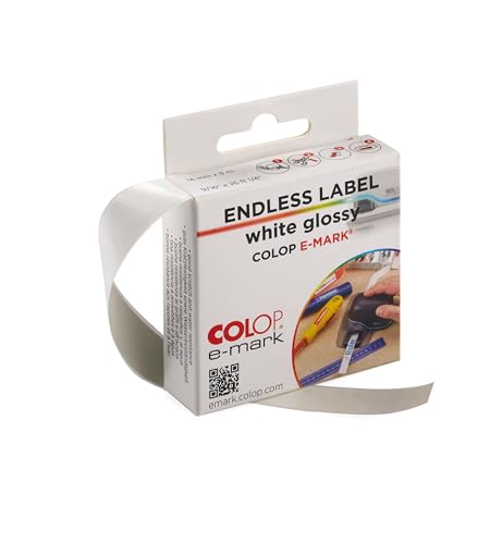 COLOP e-Mark oändliga etiketter vit glänsande, 14 mm x 8 m rulle, stänksäker och reptålig. Tillbehör e-märke, e-Mark Create och e-Mark go.