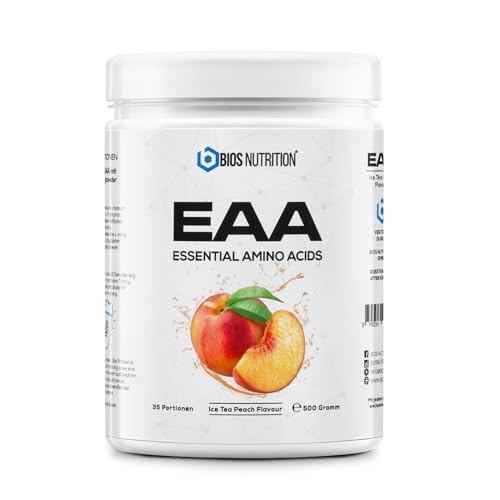 EAA-pulver ICE TEA PERSIKA 500gr - essentiella aminosyror - 11gr protein per portion - utan dålig eftersmak - vegan & högdoserat - BIOS Nutrition (Tillverkad i Tyskland)