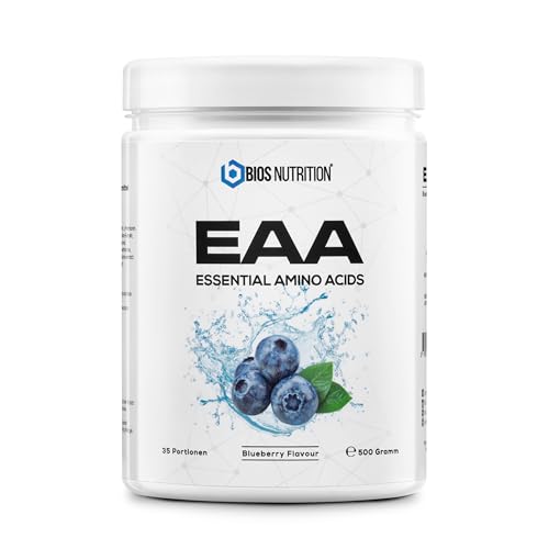 EAA-pulver BLÅBÄR 500gr - essentiella aminosyror - 11gr protein per portion - utan dålig eftersmak - vegan & högdoserat - BIOS Nutrition (Tillverkad i Tyskland)