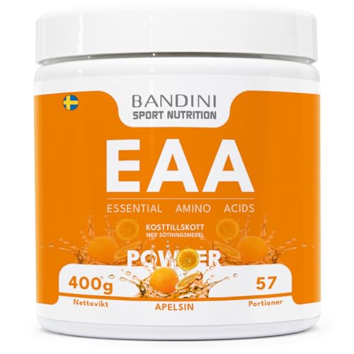 Bandini® EAA Essential AMINO Powder - 400 g pulver - Med 9 fermenterade och ramifierade essentiella aminosyror BCAA 2:1:1 - Muskelåterhämtning - Intra Pre Post Workout - 100% vegan - Apelsinsmak
