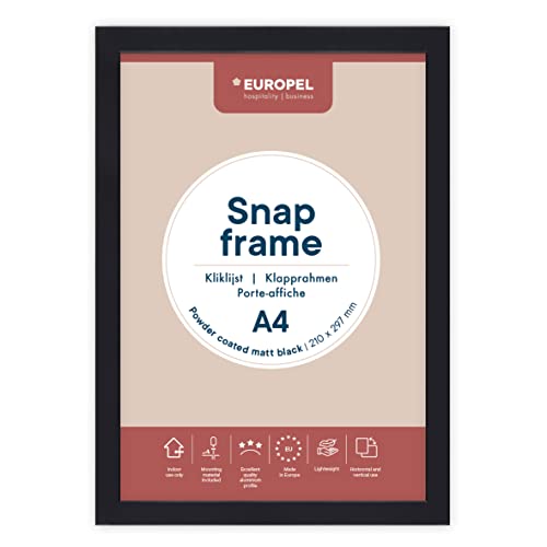 EUROPEL lätt hopfällbar ram DIN A4 matt svart pulverlackerad, Easy-Click System, profil 25 x 11 mm, anodiserad aluminium och bländfri skyddsfilm, yttermått 241 x 328 mm, grå polystyren baksida