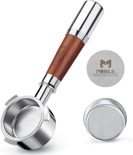 MORILS Bottenlös filterhållare 51 mm, kompatibel med DeLonghi EC680/EC685, 51 mm, filterhållare i rostfritt stål med 1 kopp, valnötsträ och skarvhandtag i rostfritt stål, 3 öron