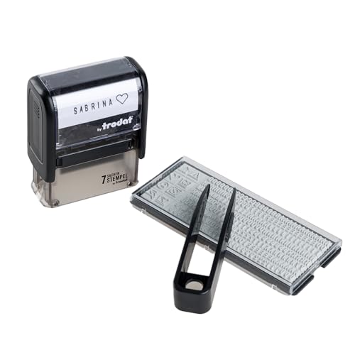 Trodat 7 saker stämplar för markering av personliga föremål, stämpelset för egen design – 3 rader, tyska, textilstämplar maskintvättbara, 38 x 14 mm, svart avtryck, inkl. tillbehör