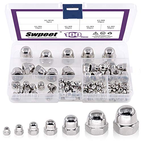 Swpeet 100 st 304 rostfritt stål tandad metrisk ekollon muttrar sexkantig kupol keps sortimentsats, 7 storlekar - M3 M4 M5 M6 M8 M10 M12