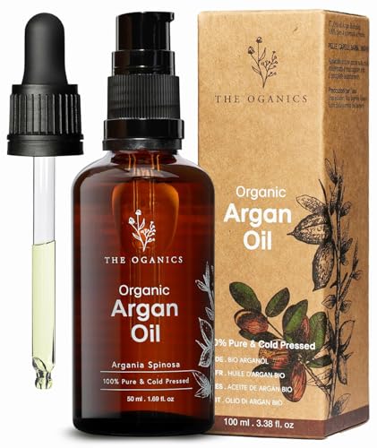 THE OGANICS® Arganolja Ekologisk 100% Ren, Kallpressad i Marocko – Reparerar & Närar, Anti-Age – Arganolja för Hår, Ansikte & Kropp – Vegansk Argan Oil – Glasflaska med Pump & Pipett – 50 ml