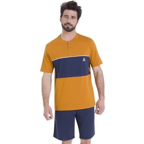 Athena Kort pyjamas för män, nattkläder chic - 100% ekologisk bomull - kortärmad T-shirt tunisisk krage + shorts - Oeko-TEX® Standard 100 och GOTS-certifierad, Hög honung + konstruktion/botten