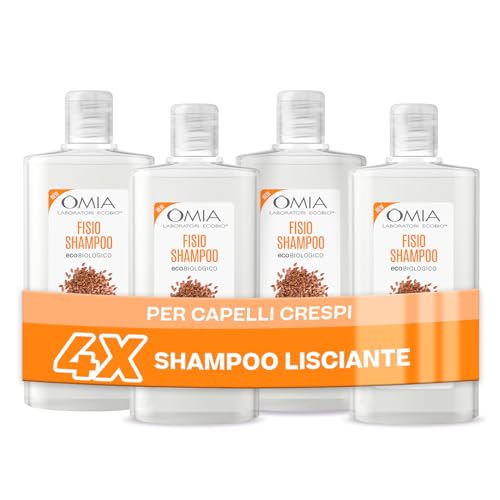 Omia, Fysio Ekologiskt schampo med linfröolja, för krusigt hår, utjämnande och disciplinerande, lämplig för frekvent användning, silikonfri, dermatologiskt testad - 4 flaskor à 200 ml