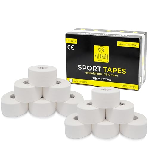 KALAHARI 12 rullar Sporttejp extra lång (totalt 164 m) Sportband, bandage, Fingertejp volleyboll, Fotboll, Klättring tejp, Handtejp. Sport tape, icke-elastisk, 100% bomull, vit - 3,8 cm x 13,7 m