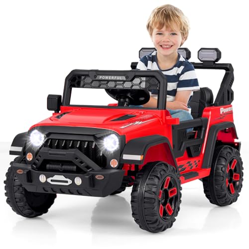 GOPLUS Elbil för barn, 12 V, 2-sitsig barnbil med fjärrkontroll på 2,4 GHz, strålkastare, musik, coola ljuseffekter och förvaringsväska, med långsam start, för 3–8 år (röd)