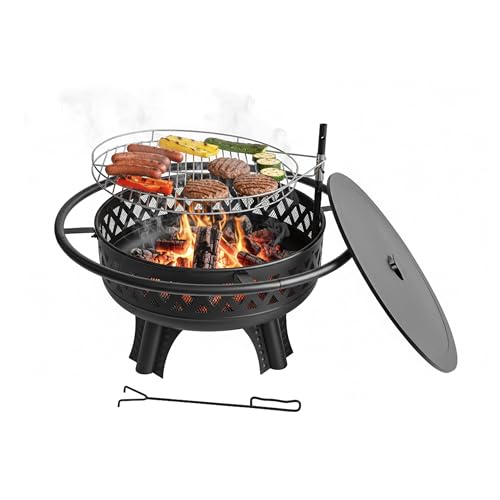 Eldskålar Ø 71 x 65 cm, Eldskål med Gnistskydd, Eldskål Trädgård inkl. Poker och Kolgaller, Eldkorg Retroutseende, Eldstad för Trädgård Camping Strand – Blommor Gräsmönster